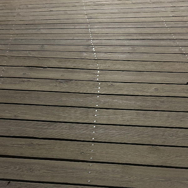 I pick up the beach walk again and as I look down at the palisade boards , two parallel lines of what look like sequins shine in the dampness , reflecting the light from the beach lights , looking closer it turns out they are neat rows of Philip screw heads.