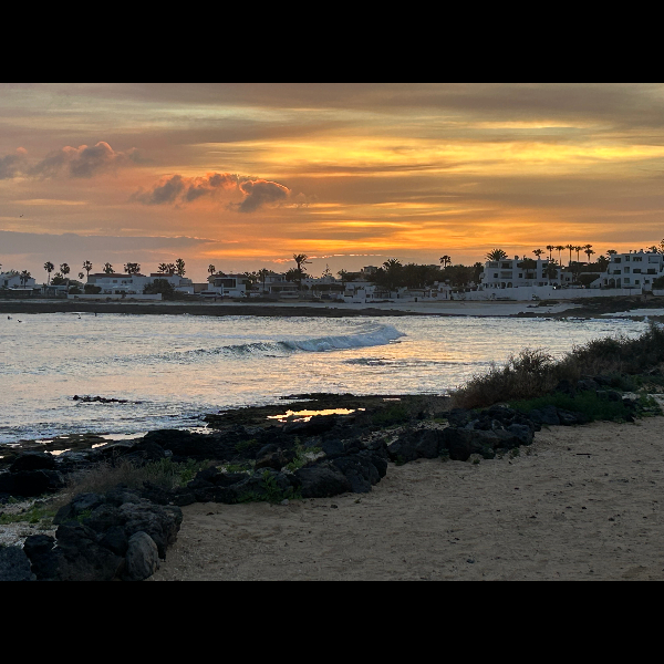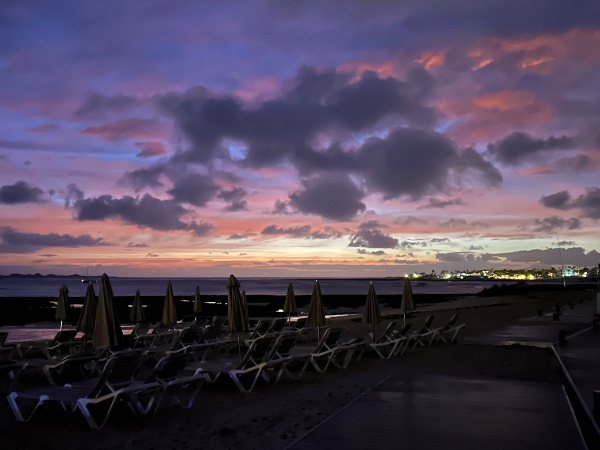 The view from the upstairs terrace is of Lanzarote in the distance, the slopes of the island hills, normally a dark volcanic brown are , due to the unusual amount of rainfall , a soft moss green, lengths of cloud shadow slide across the slopes a moving reflection. . Lines of white streaked about, which are urbanisations, the Artist César Manrique made it his fundamental ambition to oppose the construction of high rise building on the island. Anyway thats by the by. Between Lanzarote and the shore beneath my terrace is stretch of sea, rough enough for windsurfers, surfers and hydrofoils . It’s like watching jokey splotches of colour dancing on the waves. I’m so envious.